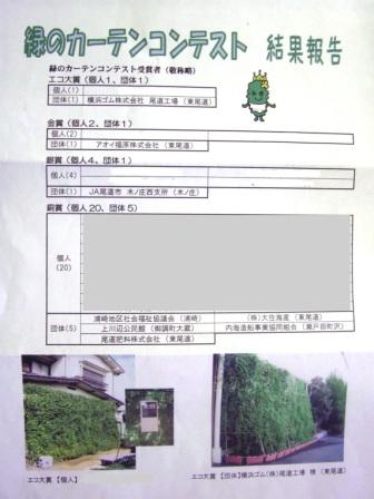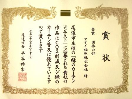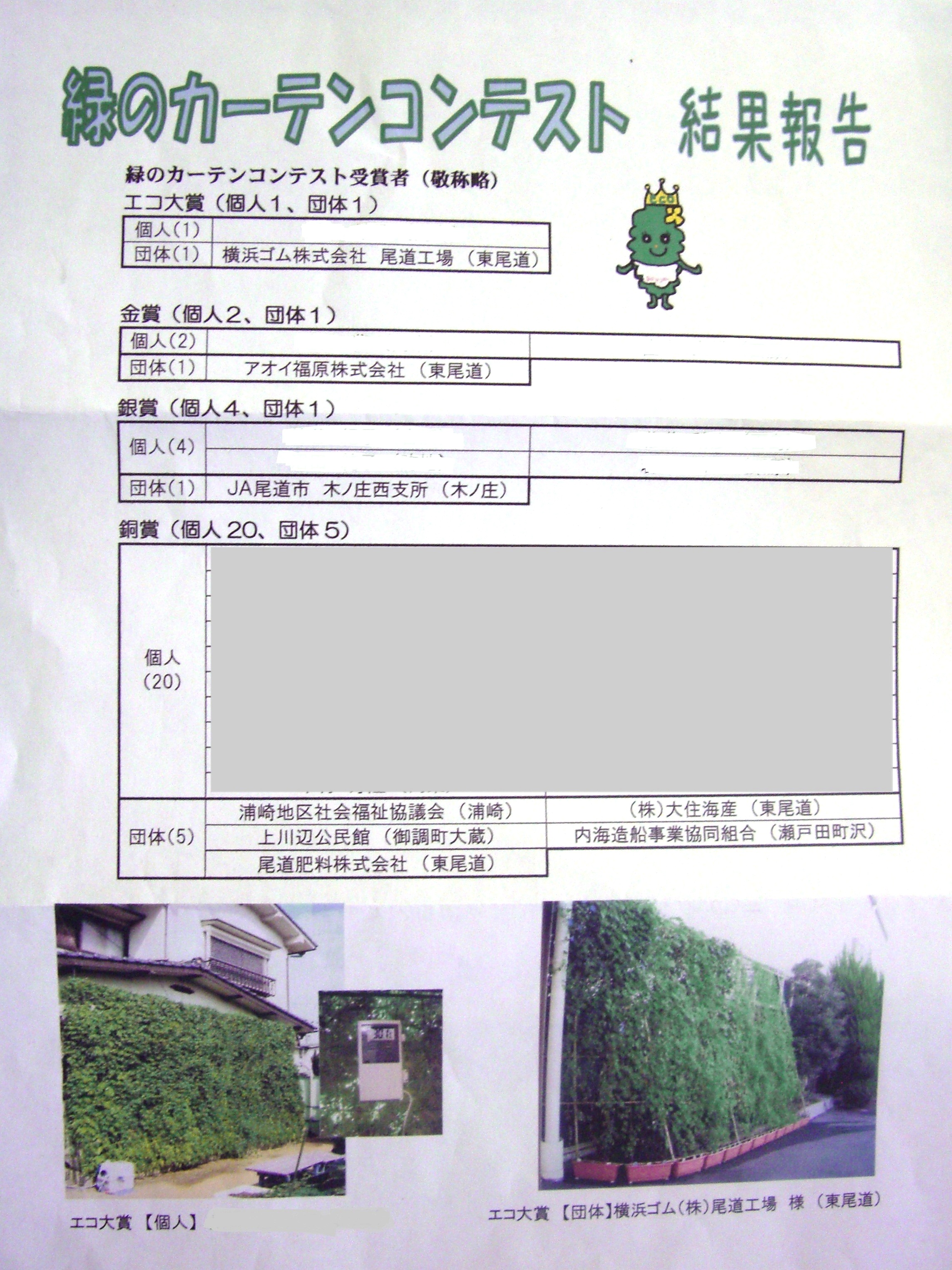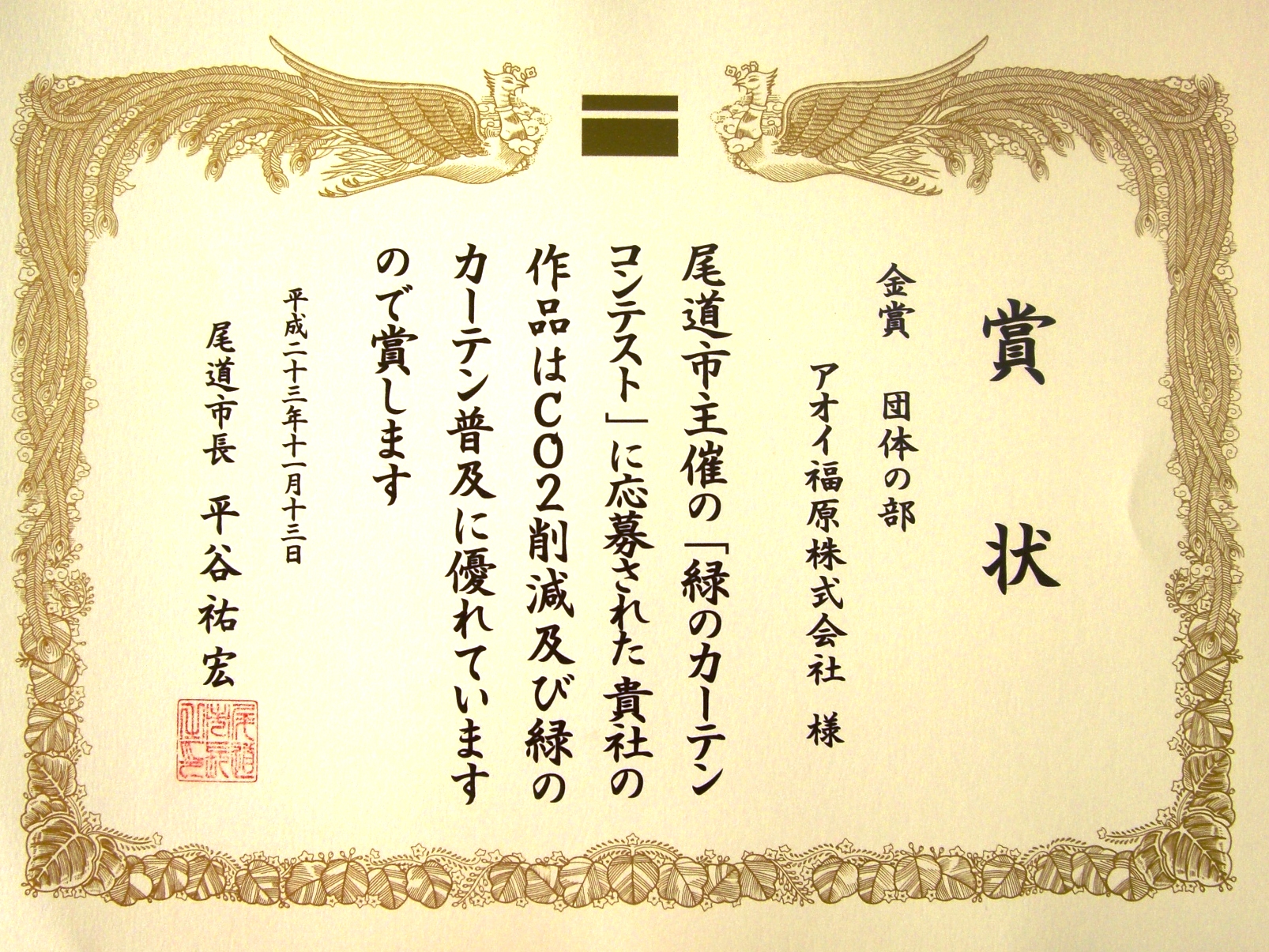 この度、尾道市主催の2011年緑のカーテンコンテストで金賞を受賞いたしました。(緑のカーテンの様子はこちらです。)それに伴い、11月13日に尾道市公衆衛生大会内で実施されます表彰式に参加してまいりました。尾道市公衆衛生大会では、環境標語等の様々な表彰がされました。1枚目の写真は、その環境標語の表彰の様子です。 「温暖化 溶けた氷は 地球の涙」 深く考えさせられました。 当社の表彰は筆者が壇上に上がり表彰されてましたので写真がありません。その代わりに、コンテストの結果をご覧ください。(写真をクリックすると拡大されます。) そしてこちらが表彰状です。 来年も全員で頑張って今度は大賞を目指します。