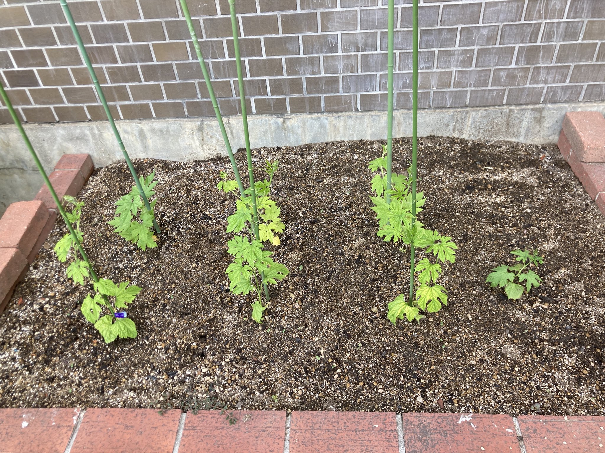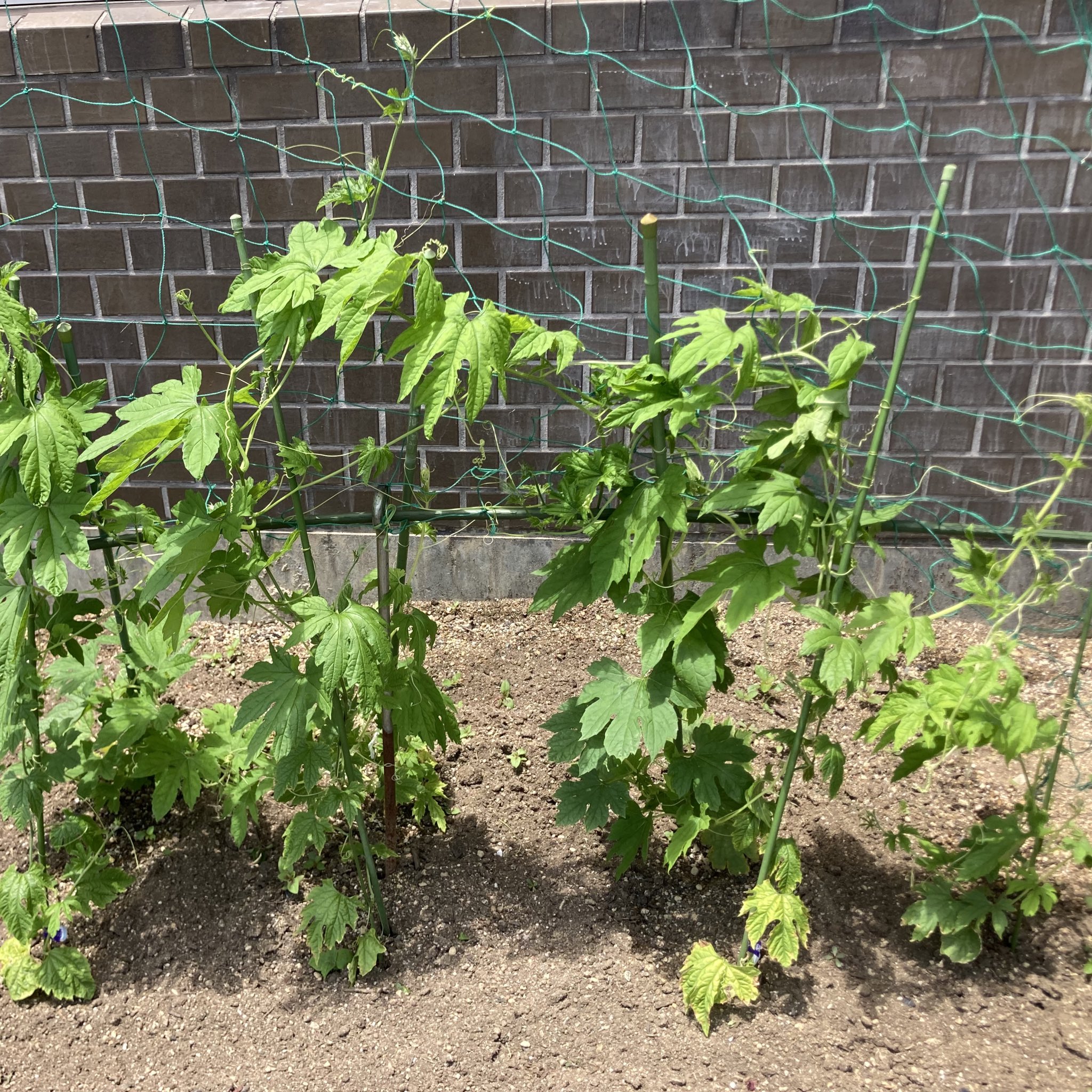 JAで6株入手し、以前植えていたゴーヤから落ちた種が芽生えたゴーヤも含めて7株でスタートしました。