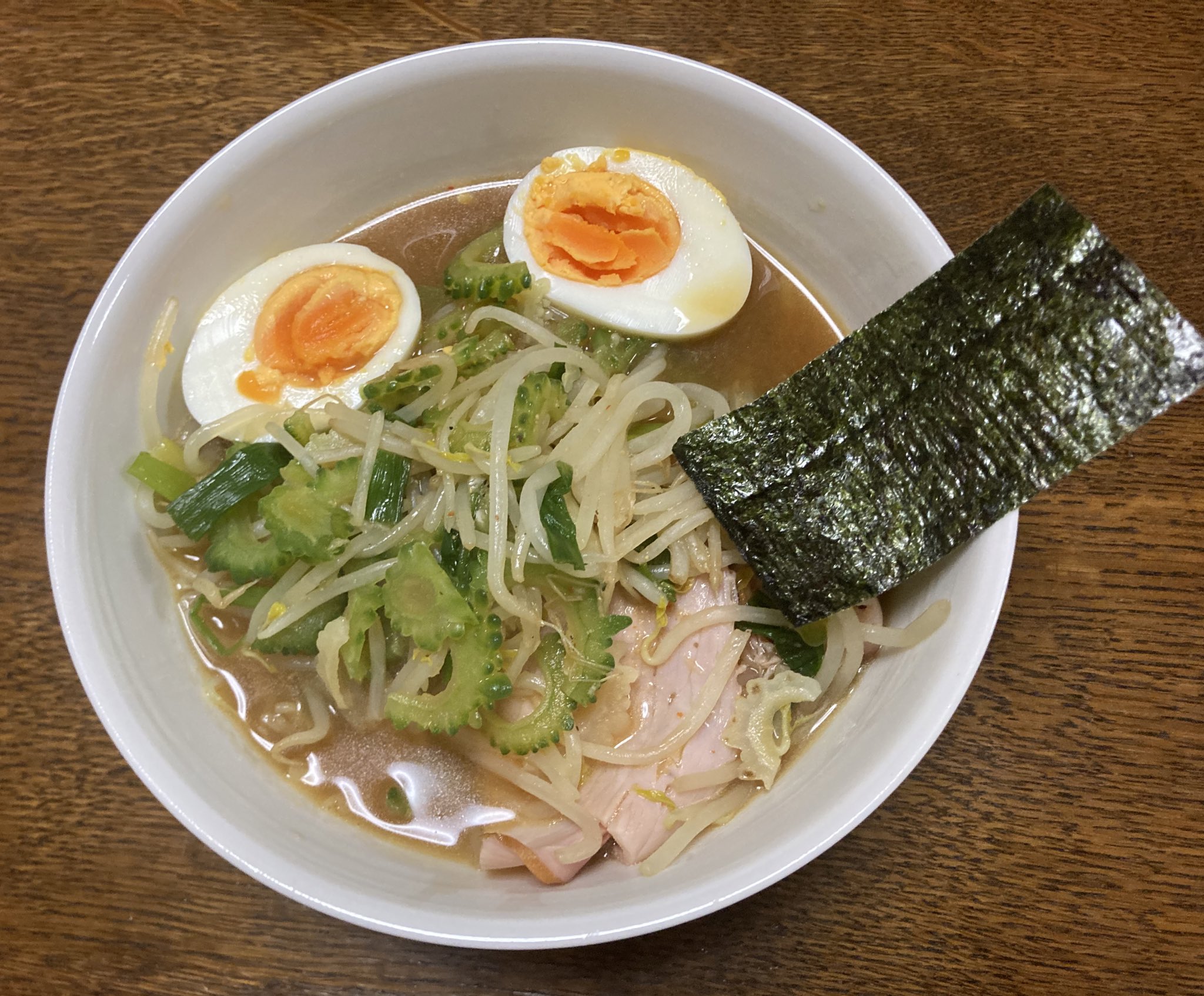 ゴーヤ入り野菜炒めのせラーメンを我が家ではいただきました。マルちゃん正麺味噌味とも相性ばっちりでした。